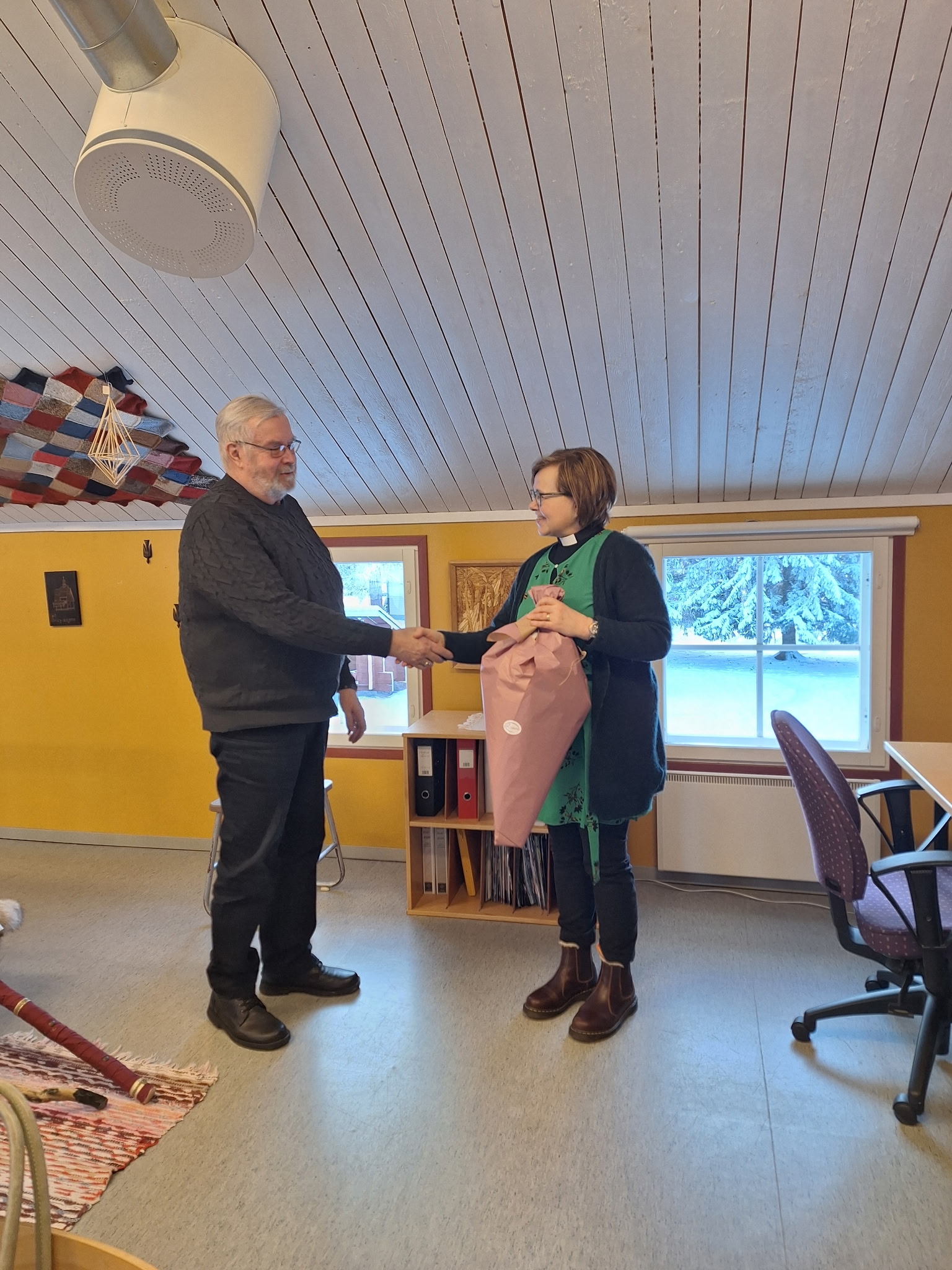 Arto Tuohimaa ojentaa kukat Eeva Mertaniemelle 12.2.26.